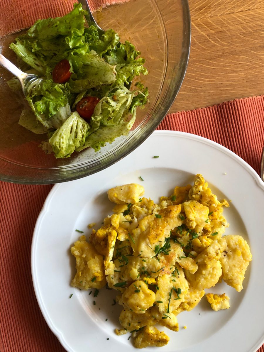 Eine dickflüssige Teigmasse aus Mehl und Wasser rühren, ev. etwas Milch dazu. Mit dem Löffel Nockerl ausstechen direkt ins siedende Salzwasser tauchen. Sie sind fertig, wenn sie oben schwimmen. Mit dem Schaumlöffel herausnehmen und in einem Sieb gut abtropfen lassen. In einer Pfanne Butter schmelzen, die abgetropften Nockerl drin abschmalzen, dann verschlagene Eier dazu, salzen und pfeffern, umrühren bis die Eimasse gestockt hat. Mit frischem Schnittlauch überstreut und grünem Salat servieren.