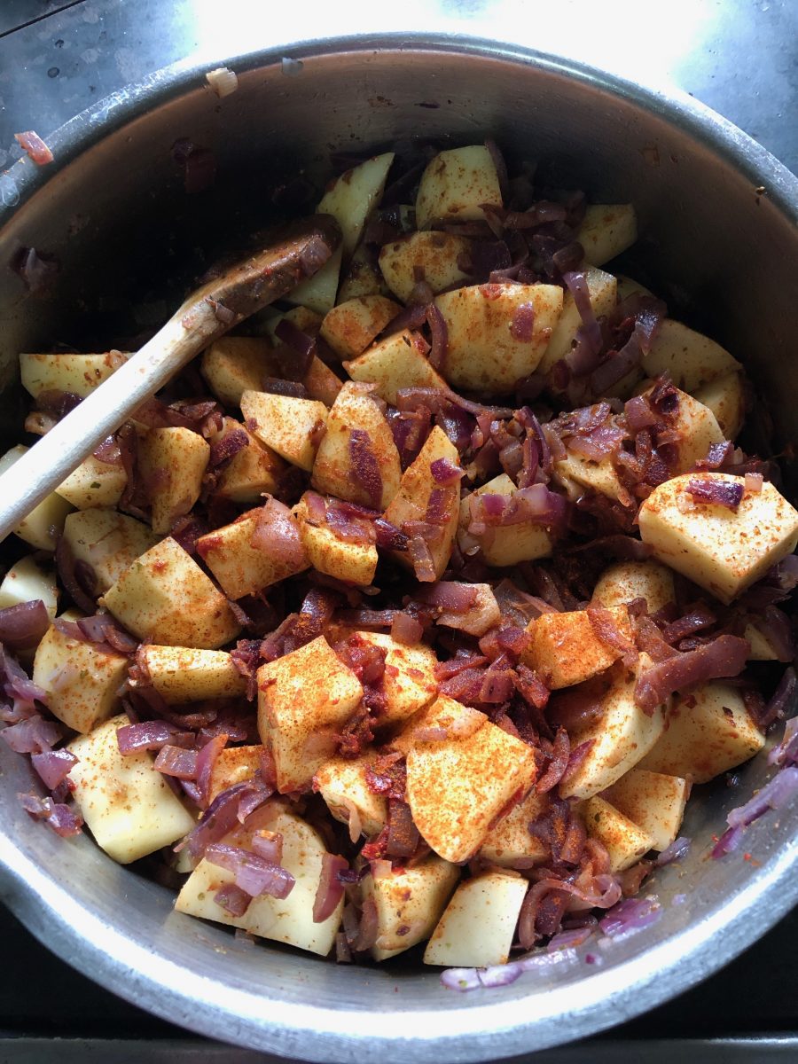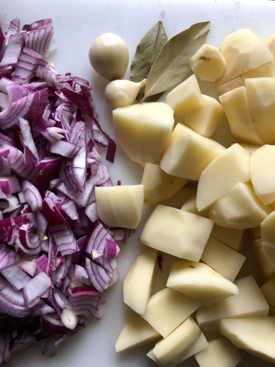 Etwa gleich viel in Würfel geschnittene Zwiebel zuerst in Öl angeröstet, dann gleich viel geschälte gewürfelte Erdäpfel dazu. Mit Paprika, Majoran und einem Kaffeelöffel Tomatenmark würzen, mit einem Schuss Essig löschen und mit Gemüsesuppe aufgiessen. Lorbeerblatt sowie Knoblauch dazu und auf kleiner Flamme weich köcheln. Mit Salz und Pfeffer abschmecken.