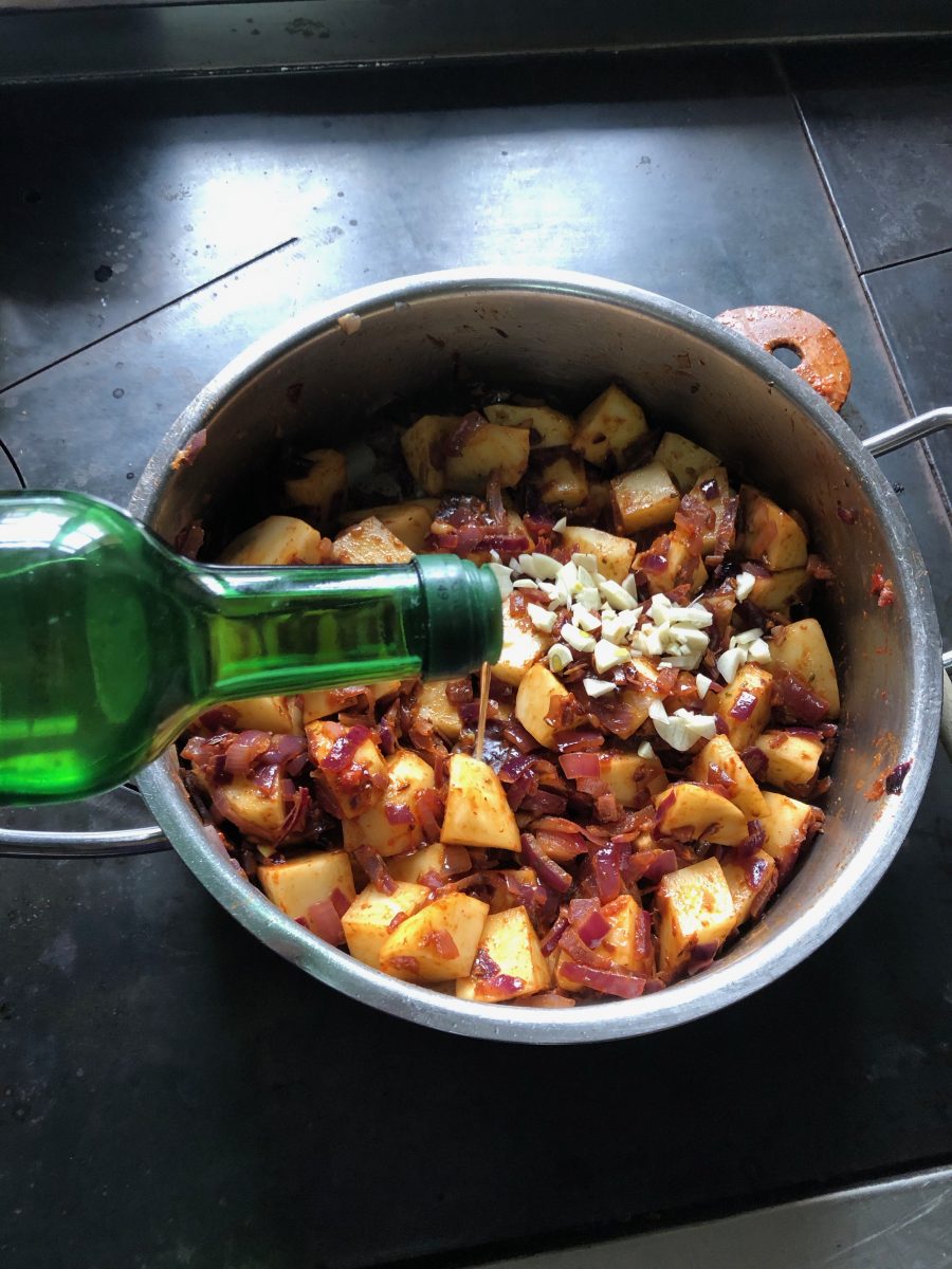 Fortgesetzte Mannschaftsverköstigung bei bemerkenswert kühlem Maiwetter erinnert an weitere einfache Klassiker. Erdäfelgulasch ist kostengünstig, einfach und rasch herzustellen.