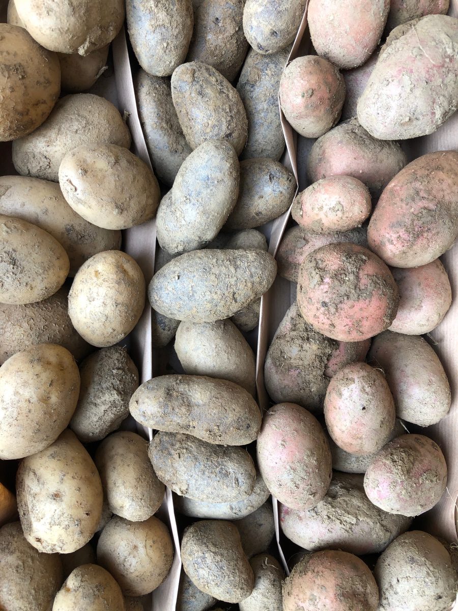 Eine einfache Version der klassischen Vichysoise, weil unsere Kartoffelernte heuer besonders gut ausfiel: blaue, rotschalige und gelbe ergeben eine bunte Gemüsesuppe.