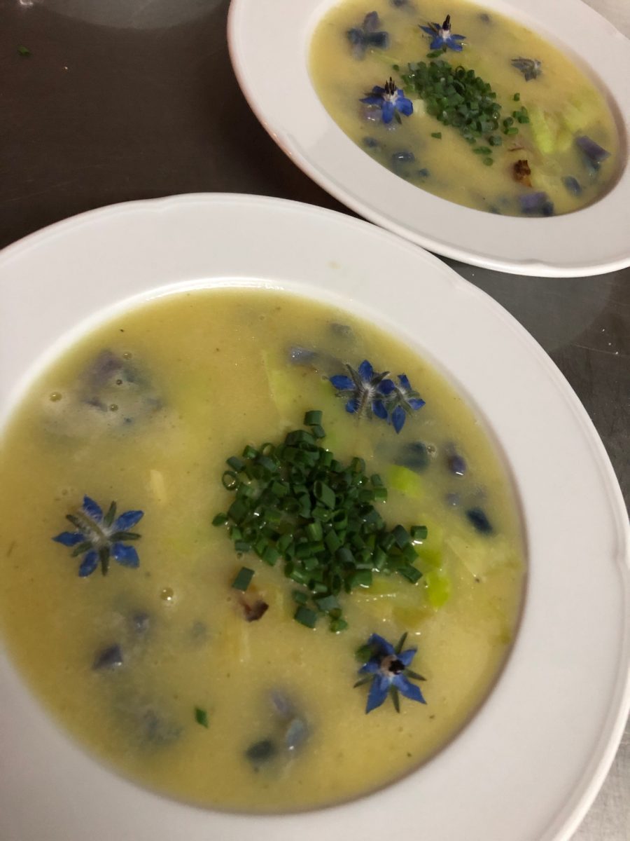Lauch und blaue Erdäpfelwürfel als Einlage in die Teller, mit heißer Suppe übergiessen, mit Schnittlauch und Blüten dekoriert servieren.