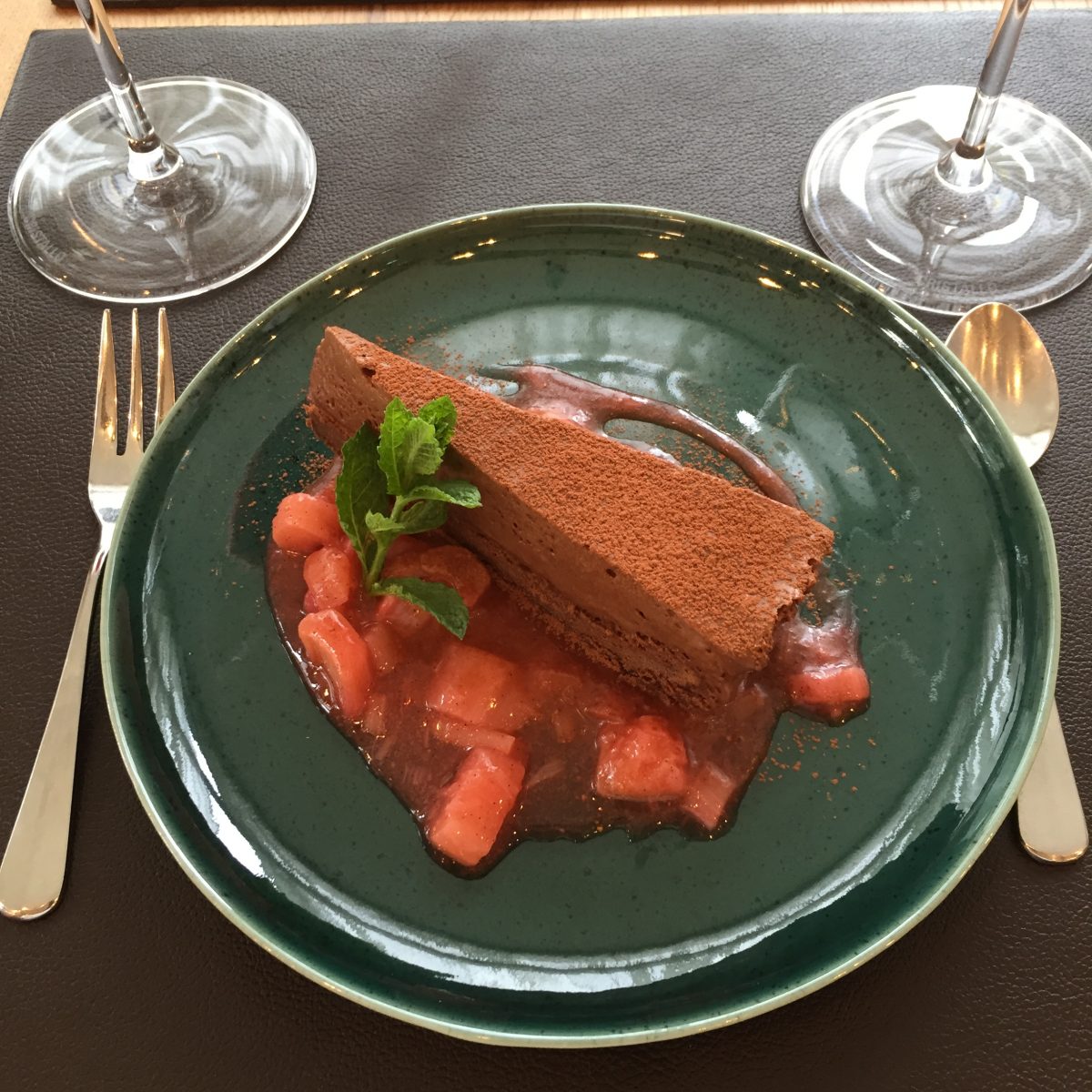 Und wie der Zufall es so wollte, gab es dann unlängst beim Maibock Kochkurs im Steirawirt der Geschwister Rauch zum Nachtisch ausgerechnet eine Andrássy-Torte: diese ist nun ganz ähnlich, wird aber vorm Servieren gefroren, allerdings nicht zu lange, ohne dass die Creme zu hart wird. Dazu noch Rhabarber mit Waldmeiser-Erdbeersosse ist ohnehin Luxus-Ergänzung.