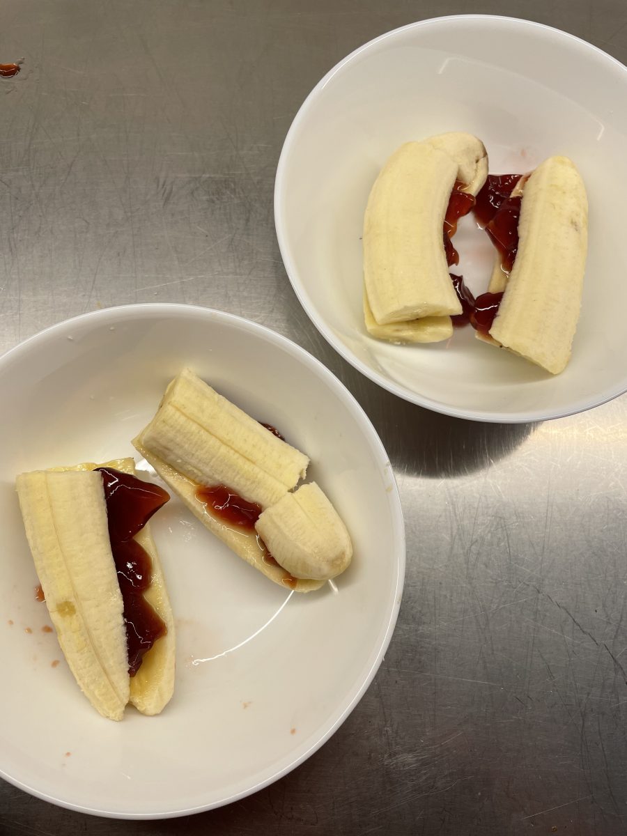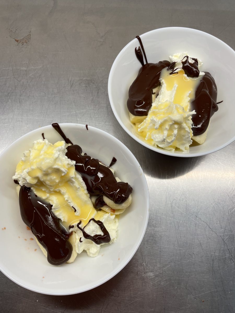 Einfach Bananen schälen, der Länge nach halbieren. Die Hälften mit – bei mir vorzugsweise Weichselgelee – füllen. Mit Schokoladesosse bedecken, Schlagobers darüber spritzen. Nochmals mit Schokososse dekorieren, eventuell sogar Eierlikör oder/und Mandelsplitter darüber. Eine tolle Schweinerei!