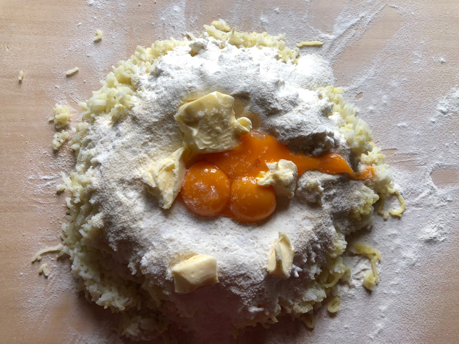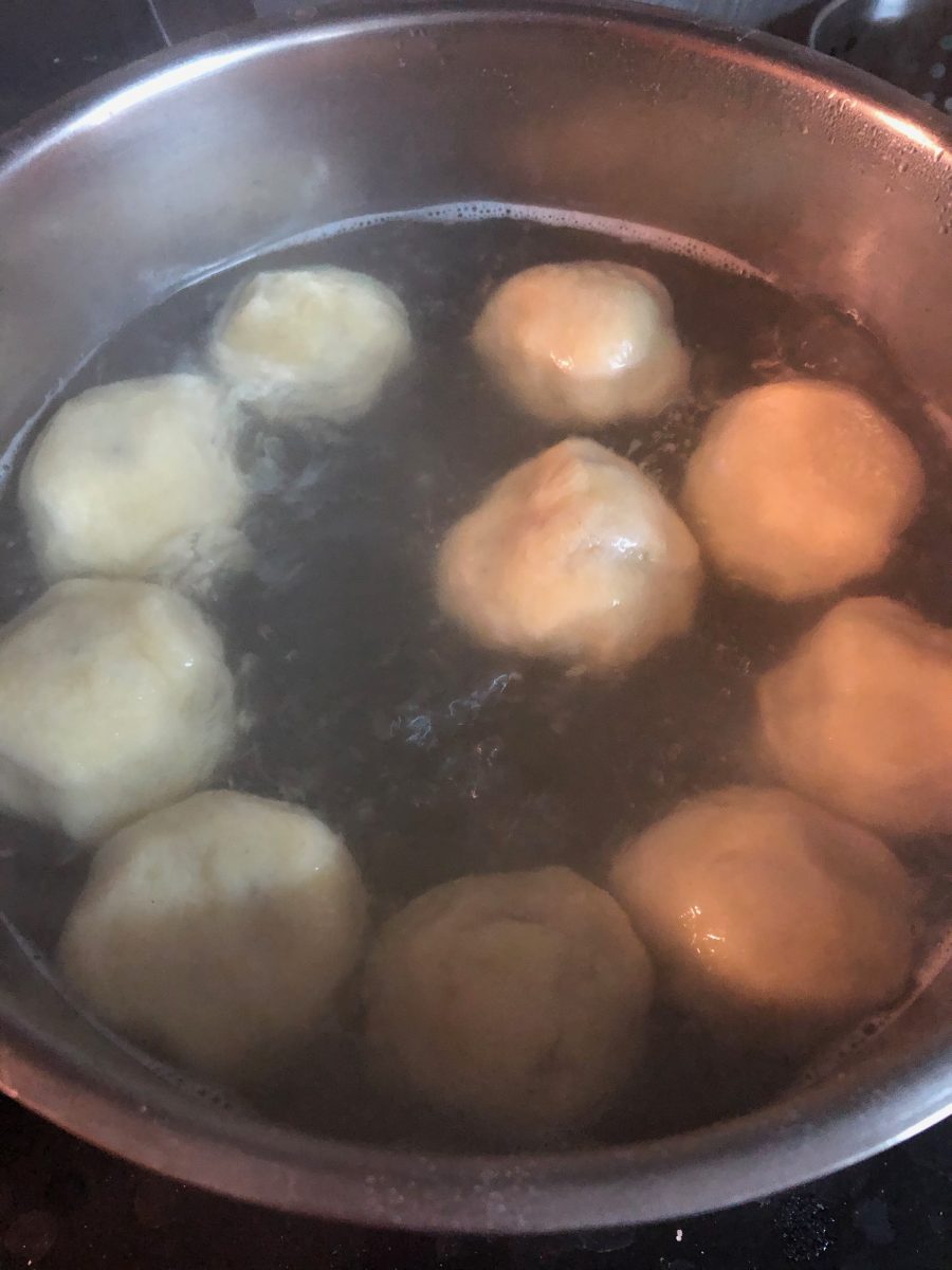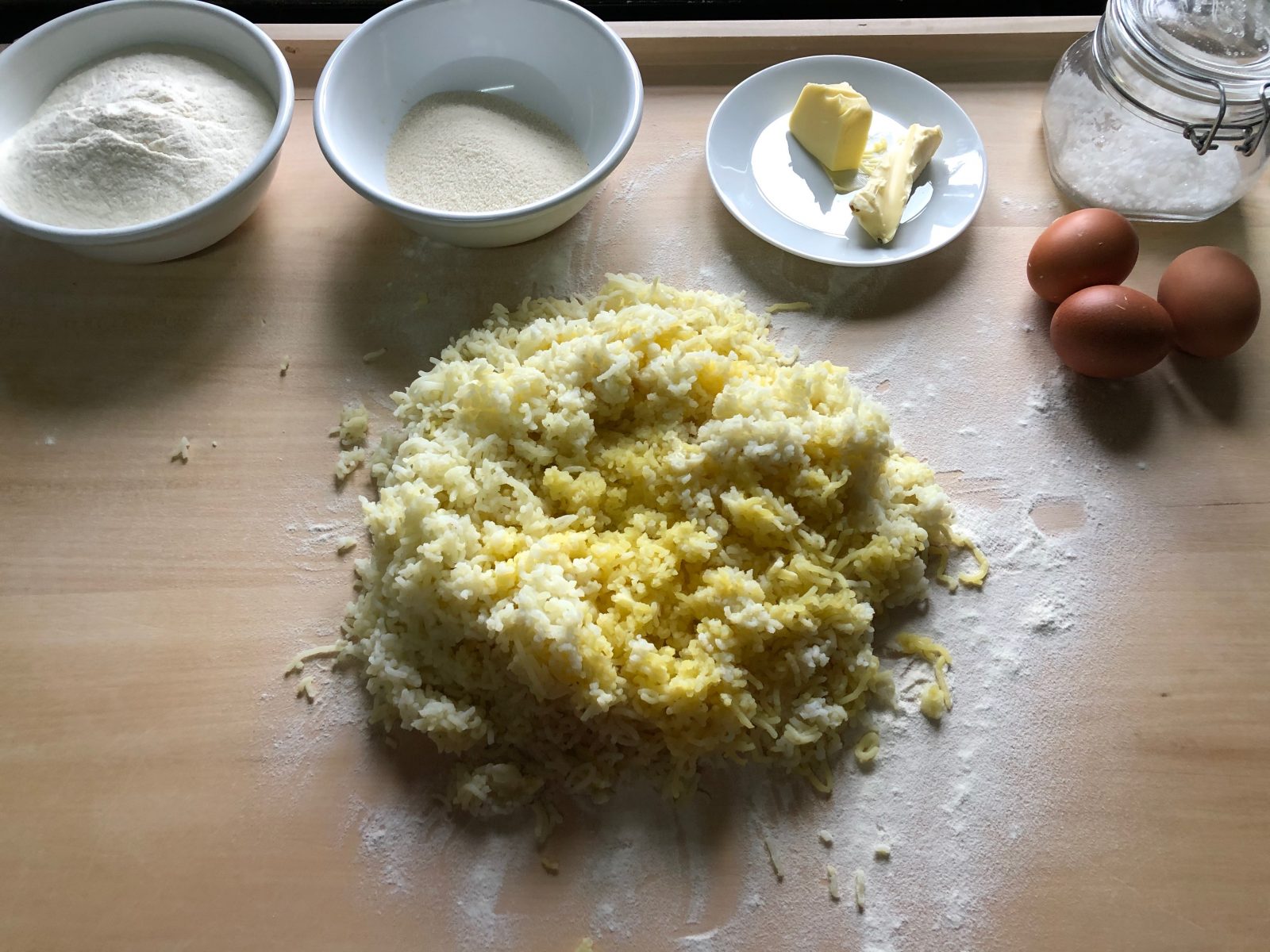 1kg mehlige Erdäpfel in der Schale kochen, heiss schälen und auf ein bemehltes Brett pressen. In den Haufen eine Grube machen und etwas auskühlen lassen. Mit ca. 300g griffigem Mehl, ca. 100g Griess, ca. 70g Butter, 3 Dottern und guter Prise Salz zu einem Teig verkneten. Diesen 30 Minuten rasten lassen, dann zu einer Rolle formen, davon Scheiben schneiden. Auf diese je ca. 1 EL gesalzene Grammeln platzieren und zu Knödeln formen. die Knödel ins kochende Wasser und so lange sieden bis sie oben schwimmen. Wie immer empfehle ich hier das „Opfer“ eines Probeknödels. Mit einem Schaumlöffel herausheben und servieren.