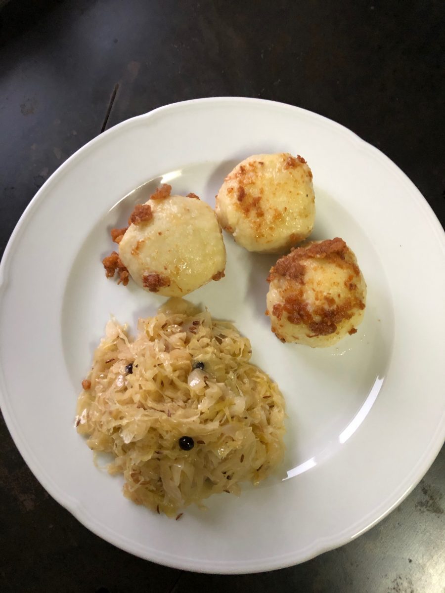 Bei Oma gab’s klassischer weise Sauerkraut dazu, aber auch Grünen Salat mit gezuckerter Zitronenmarinade. Und für die Karnivoren ausserdem noch Selchripperl. Teigreste wurden dann zum Nachtisch als „Wuzinudeln“ serviert, in Butterbrösel gewälzt und gezuckert, mit Apfelkompott dazu. Danach wälzt man sich selber zur Siesta…