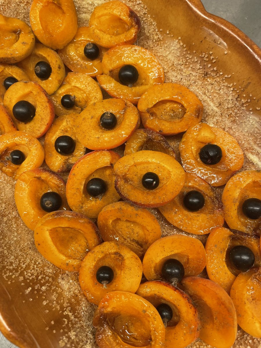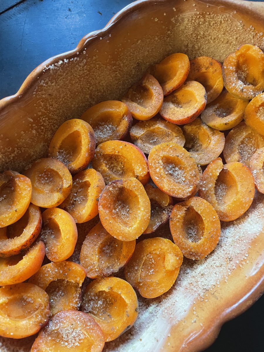 Marillen sind Aprikosen und Weichseln sind Sauerkirschen. Ihre Kombination bewährt sich immer schon, ob als Marmelade oder als Dessert. Hier also die erste nennenswerte Marillenernte ergänzt durch Weichseln aus Qirins Garten. Einfach die Marillen halbieren und entkernen. In eine gebutterte und mit braunem Kristallzucker bestreute Auflaufform legen. In jede Marille kommt statt des Kerns eine entsteinte Weichsel. Nochmals reichlich Rohrzucker und etwas Zimt darüber. Schliesslich mit einer Streuselmischung aus geriebenen Mandeln, Mehl, Zucker, Butter und 1 Ei darüber. Etwa 20 Minuten backen und noch heiss mit flüssigem Obers oder einer Kugel Vanilleeis servieren.