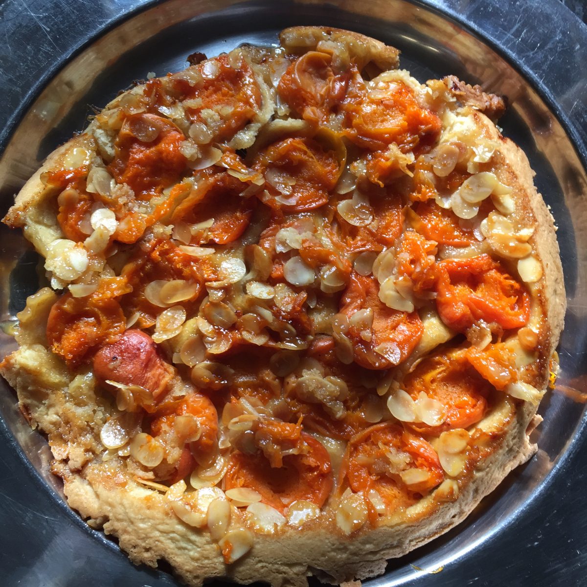 Einen Mürbteig aus 125 g Mehl, 70 g Butter, 35 g Zucker, 1 Dotter, 1 Prise Salz, 1 EL Lavendelessig zubereiten, kühl ruhen lassen. Marillen entkernen und halbieren. 2 EL Butter in einer feuerfesten Pfanne (kein Plastikgriff!) schmelzen, 3 EL gehobelte Mandeln und 3 EL Kristallzucker verteilen und sobald der Zucker schmilzt die Marillen auf dem Pfannenboden verteilen. Den kreisförmig ausgewalkten Teig darüber und ca. 20 Minuten ins vorgeheizte Rohr schieben. Die fertig gebackene Tarte vorsichtig und zugleich schwungvoll (Achtung: sehr heißer Pfannengriff!) auf einen entsprechend großen Tortenteller stürzen. Lauwarm oder ausgekühlt mit leicht angeschlagenem Obers servieren.