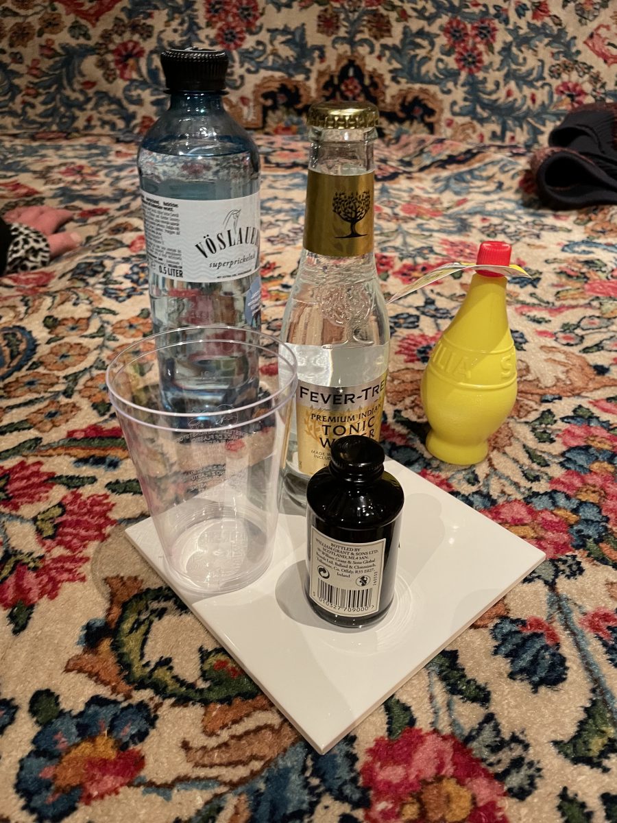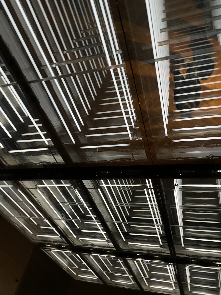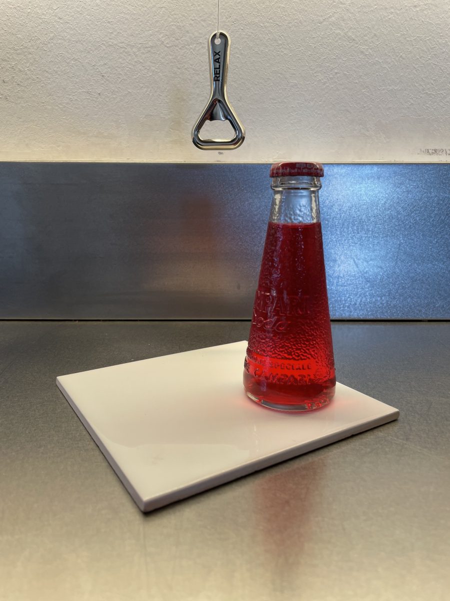Hier wird die Decke der Loosbar wieder zitiert in sich unendlich spiegelnden Neonrahmen und die drei Fassadenöffnungen funktionieren als Automaten-Bar. Jedesmal, wenn ein ausgewählter Drink mikrofon-verstärkt laut krachend in den Entnahmeschacht fällt, flackert auch die Deckenbeleuchtung.
