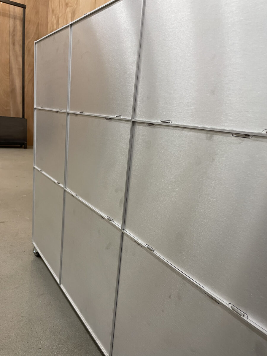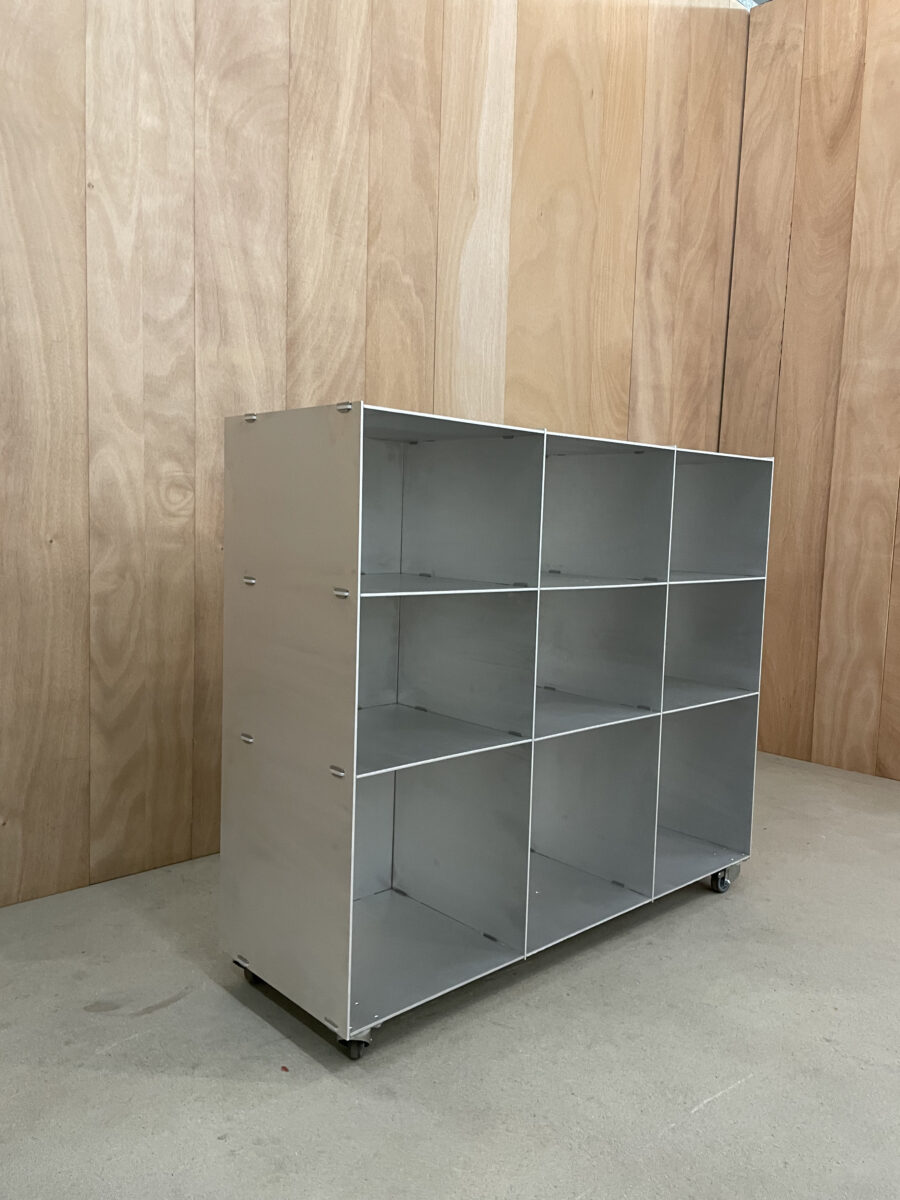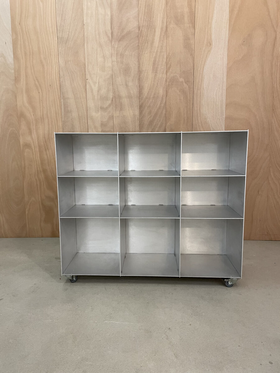 Das für einen speziellen Auftrag entwickelte Bücherregal ergänzt nun die Einrichtung der Gaststube. Es eignet sich sehr gut auch für die Aufbewahrung von Schallplatten, Geschirr und anderen Objekte. Mit seiner Tischhöhe und auf Rädern kann es modular veränderlich positioniert werden. So gibt es dem Raum Struktur und bietet gleichzeitig zusätzlichen Stauraum. Das Besondere an diesem Regal aus Aluminium ist seine Konstruktion: nur zusammengesteckt, nicht geschweisst, geklebt oder geschraubt kann es auch leicht wieder abgebaut werden.