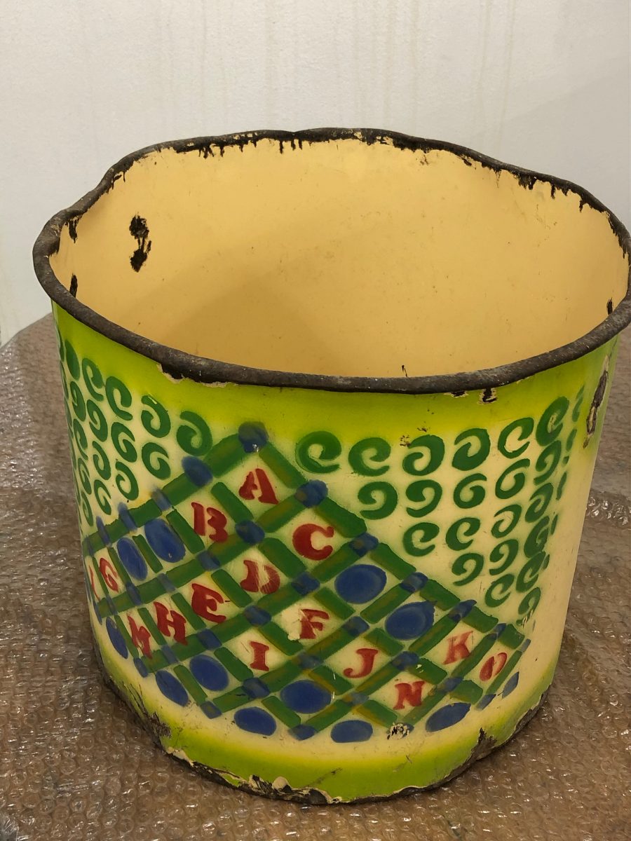 Fundstück von einer Exkursion während einer Forschungsreise über Wax und Fancyprints in Westafrika im Jahr 2002. Während eines Aufenthalts bei Freunden in den Vororten von Dakar fiel mir dieser alte Topf auf, der als Mülltonne auf der Straße verwendet wurde. Und natürlich war er sofort Objekt meiner Begierde. Das Muster zeigt nämlich ein typisches Design klassischer Waxprints. Also musste ich es haben. Es folgte eine schwierige und heikle Verhandlungsphase. Schließlich wurde er schrecklich überteuert erworben. Ich war aber froh, ihn überhaupt zu bekommen. Es war ein Muss, unsere Sammlung westafrikanischer Stoffe zu vervollständigen, und es entsprach meiner Präferenz, verschiedene Objekte unterschiedlicher Herkunft und unterschiedlichen Zwecks zu kombinieren.