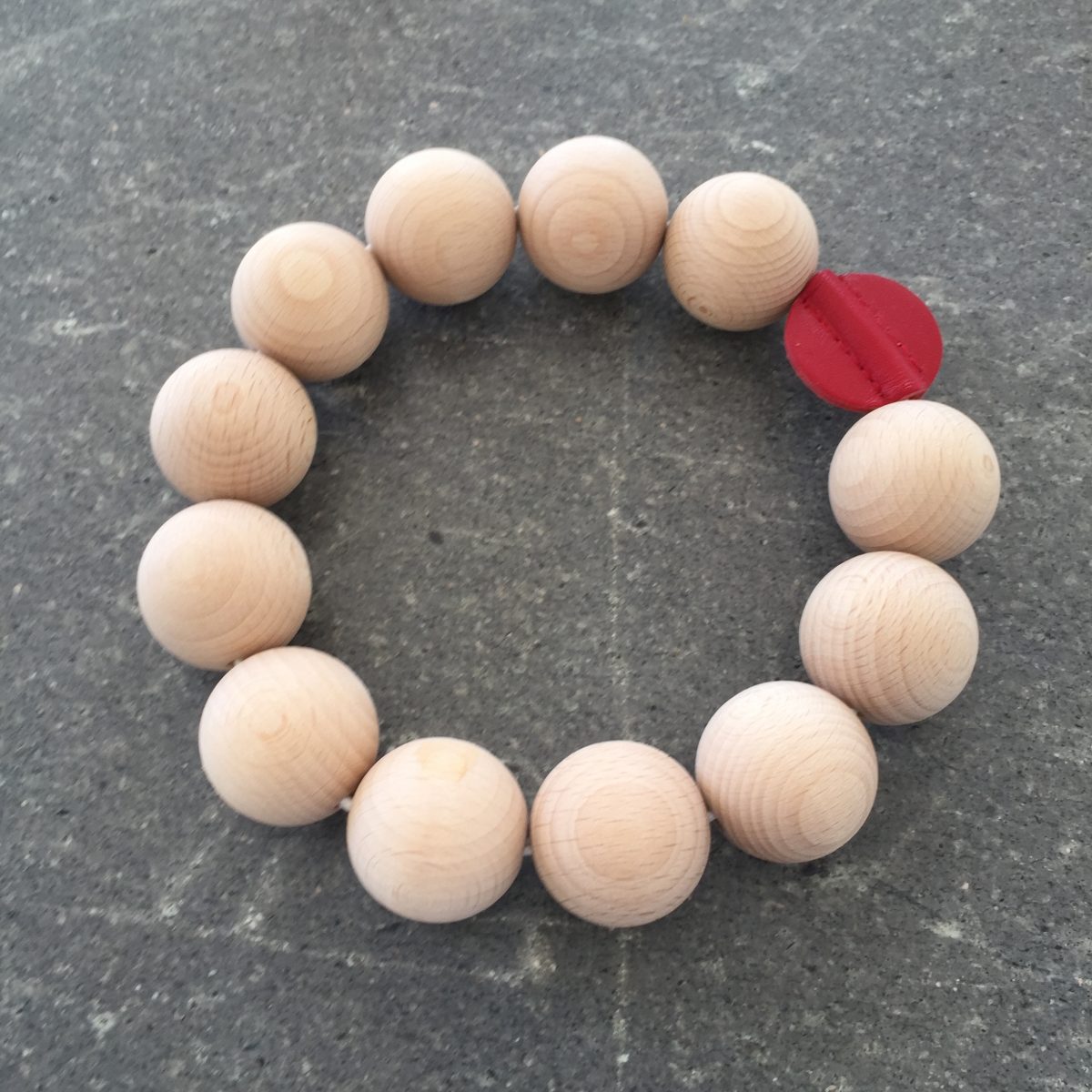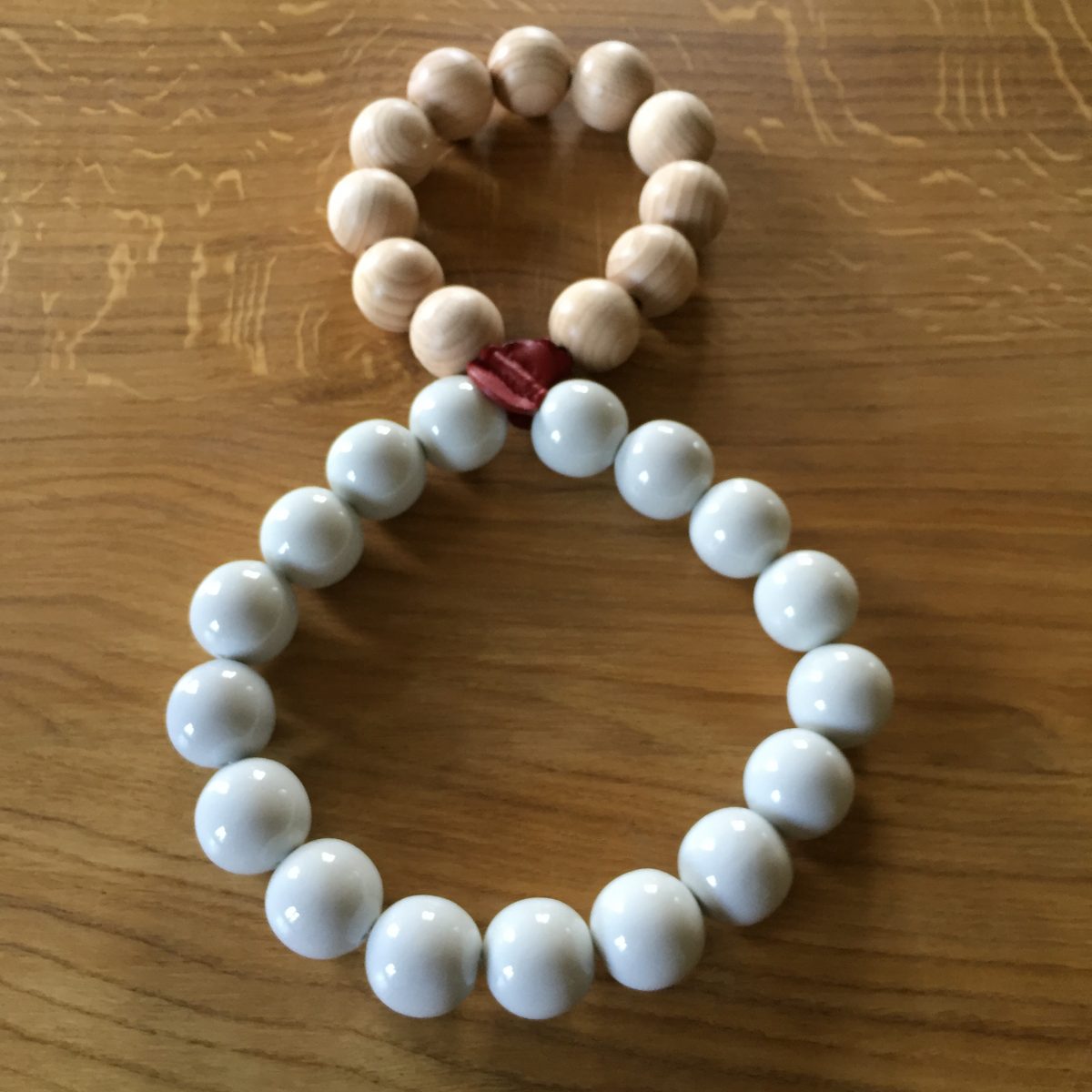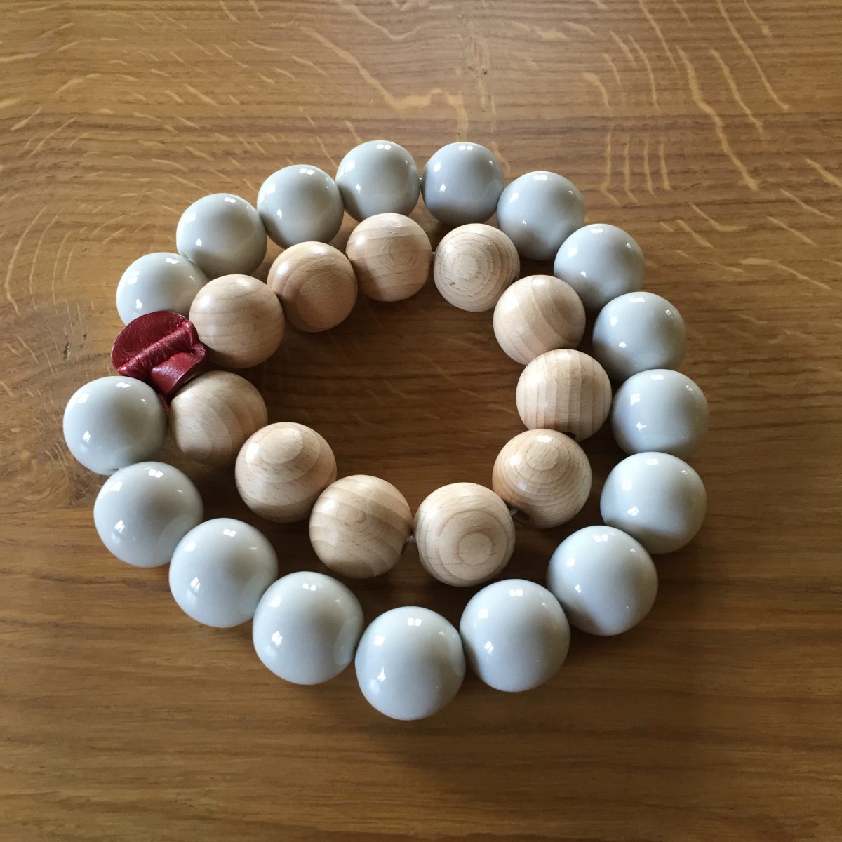 Die Untersetzer bestehen ursprünglich aus Porzellankugeln, dann auch aus Holz. Das verbindende rote Lederglied verhindert ein Davonrollen der Perlenketten vom Tisch. Nun gibt es die Perlenuntersetzer nicht nur in 2 Grössen, sondern auch mit bunter oder glänzender Goldperle.