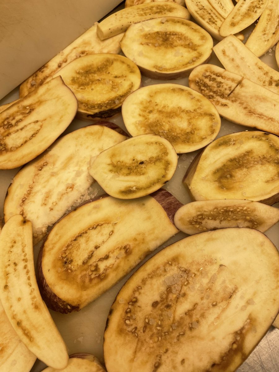 Jedes Jahr ist ein anderes Gemüse in der Natur favorisiert. Heuer sind es die Auberginen, die im Hochbeet besonders gut gedeihen. Also gibt es immer wieder Caponata oder eben Parmigiiana. Die Melanzani in Scheiben schneiden, einsalzen und beschwert lagern, damit sie „ausschwitzen“.
