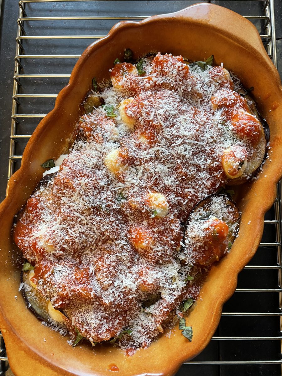 Inzwischen aus Zwiebeln, Paradeisern, etwas Knoblauch und Kräutern eine dicke Sosse zubereiten. Kurz bevor diese fertig ist auch etwas Stangensellerie beifügen. Die ausgedrückten und getrockneten Melanzanischeiben beidseitig in Olivenöl kurz anbraten. Abwechselnd mit je einer Schichte Paradeissosse und geriebenem Käse in eine Auflaufform schichten. Zuletzt in Stücke gerissenen Mozzarella und schliesslich geriebenen Parmesan und Basilikumblätter darüber. Mit etwas Olivenöl beträufelt im Rohr backen. Üblicherweise wird diese Speise lauwarm genossen, uns schmeckt sie auch warm schon sehr gut.