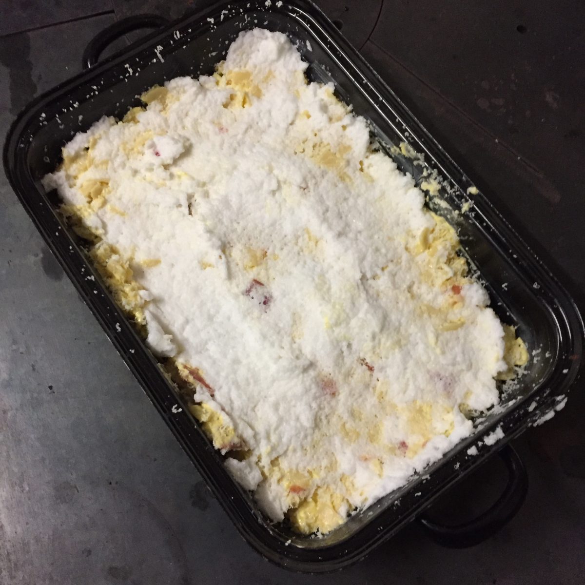 Fleckerl in Salzwasser bissfest kochen und mit kaltem Wasser abschrecken. Schinkenreste fein würfeln. Eiweiss mit einer Prise Salz zu Schnee schlagen. Dann die Dotter mit zimmerwarmer Butter, Salz, Pfeffer, geriebener Zitronenschale und Muskatnuss schaumig rühren, Rahm unterziehen, mit dem Schinken mischen. Diese Masse mit den ausgekühlten Fleckerl vermengen. Schliesslich den steif geschlagenen Eischnee unterziehen, mit etwas geriebenem Parmesan bestreuen und mit den Schneeresten bedecken. Winter adijo!