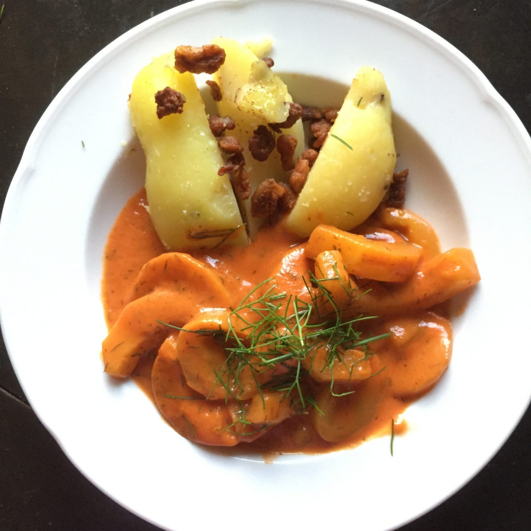 Geschälte, entkernte Gurken in ca 1 cm breite Streifen schneiden, in Butter anrösten und mit geschälten, entkernten Paradeisern samt Sosse ablöschen, fertig dünsten, Obers dazu und Dille, mit Salz und Zucker würzen und mit Salzerdäpfeln, diesmal mit Grammeln dekoriert servieren.