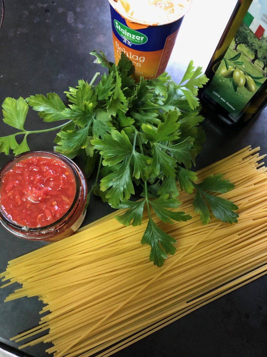 Vor etlichen Jahrzehnten waren wir mit den damals noch wirklich kleinen Kindern im damaligen Jugoslawien auf Urlaub. Auf der Insel Cres hatten wir ein Haus gemietet mit Selbstversorgung. Von einer Freundin haben wir ein Rezept übernommen, das immer noch beliebt ist. Es ging einfach, etwa so: Geschälte Paradeiser in etwas Olivenöl schmoren. Ganz ganz viel fein gehackte Petersilie dazu. Mit Obers aufgiessen, mit Salz und Pfeffer würzen und noch etwas weiter einkochen. Schliesslich geriebenen Parmesan dazu und über die al dente gekochten Nudeln giessen. Gut mischen und nochmals mit Parmesan bestreut servieren. Einfach und gut.