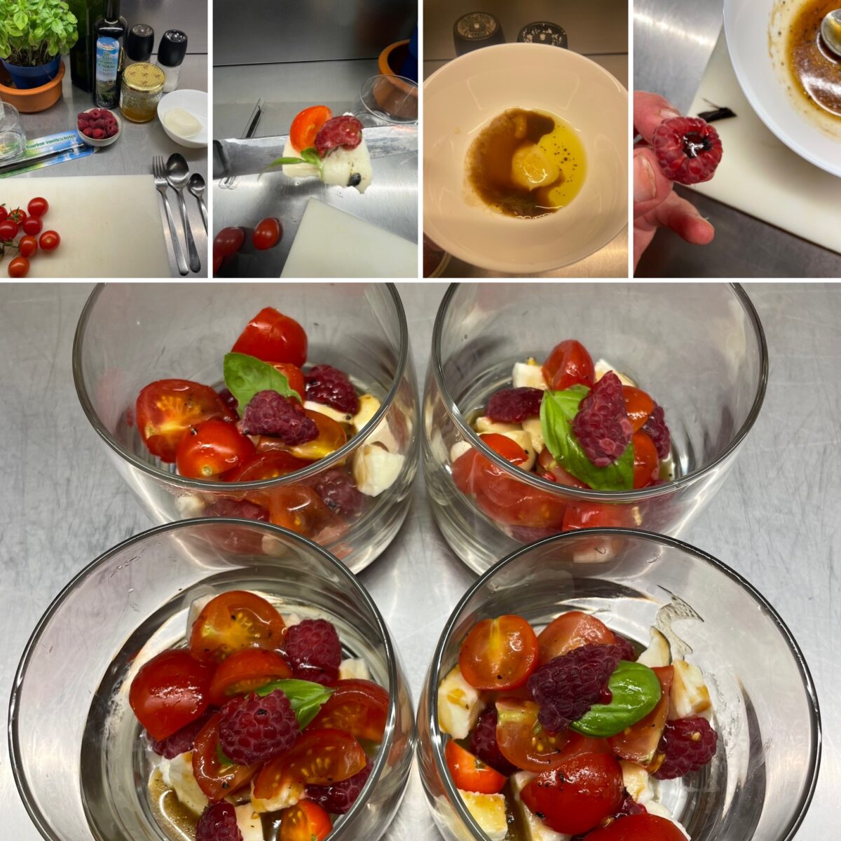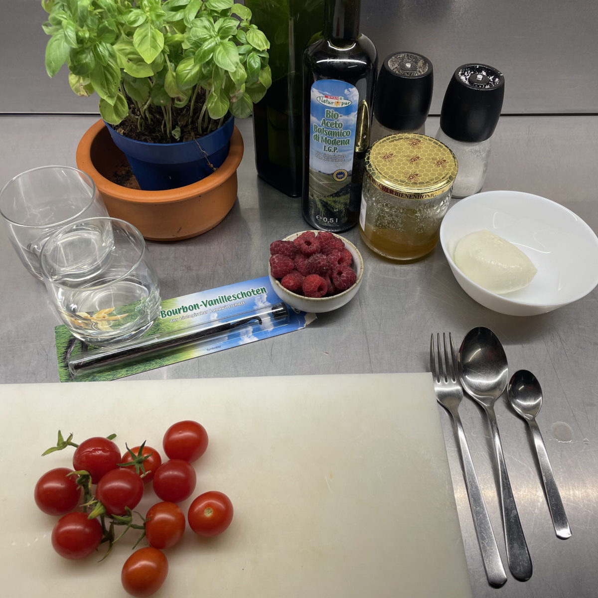 Ausgangsmaterial waren Paradeiser, Himbeeren, Basilikum, Vanille, Mozzarella, Olivenöl, Balsamicoessig, Honig, Salz, und Pfeffer. Das ist schon ganz schön viel und alles auf einmal für mich auch zu viel.