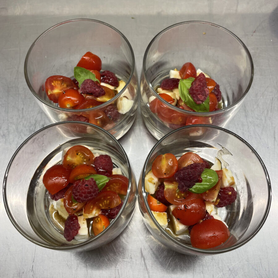 Also: geviertelte Cocktailtomaten und in kleine Würfel geschnittener Mozzarella in einem flachen, weiten Glas vorsichtig mischen. Drüber die mit je einem Tropfen Marinade gefüllten Himbeeren, ein oder zwei kleine, ganze Basilikumblättchen als farbige Dekoration darauf, mit dem Rest der Marinade beträufeln. Eine erfrischende, schmackhafte Überraschung zur Vorspeise.